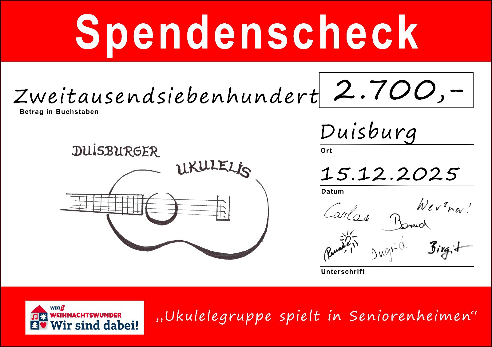 22 Dez., 2025 Spenden-Beitrag der Duisburger Ukulelis für das „WDR 2 – Weihnachtswunder 2025“ in Essen View Slideshow